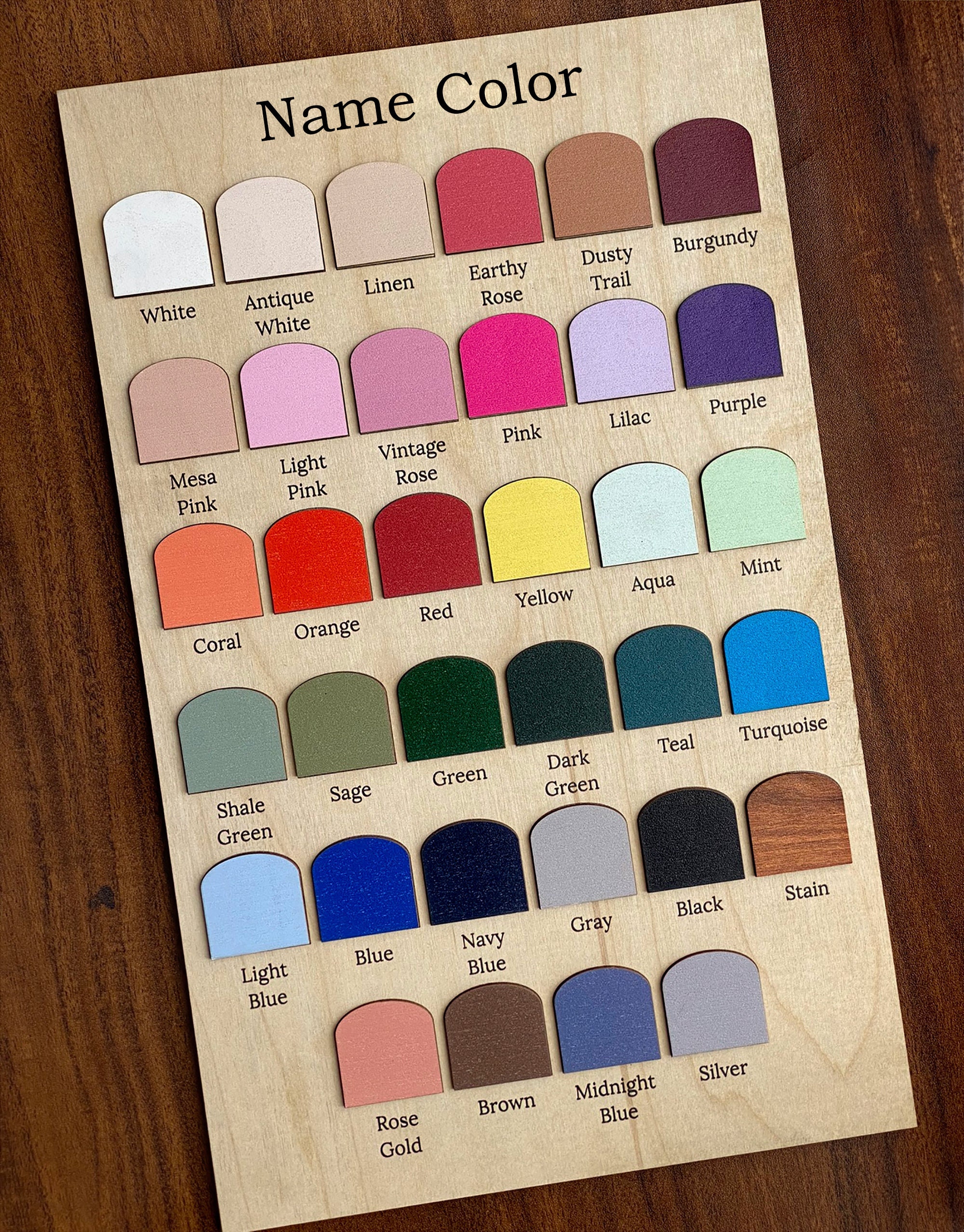 White, Antique White, Linen, Earthy Rose, Dusty Trail, Burgundy, Mesa Pink, Light Pink, Vintage Rose, Pink, Lilac, Purple, Coral, Orange, Red, Yellow, Aqua, Mint, Shale Green, Sage, Green, Dark Green, Teal, Turquoise, Light Blue, Blue, Navy Blue, Gray, Black, Stain, Rose Gold, Brown, Midnight Blue, Silver